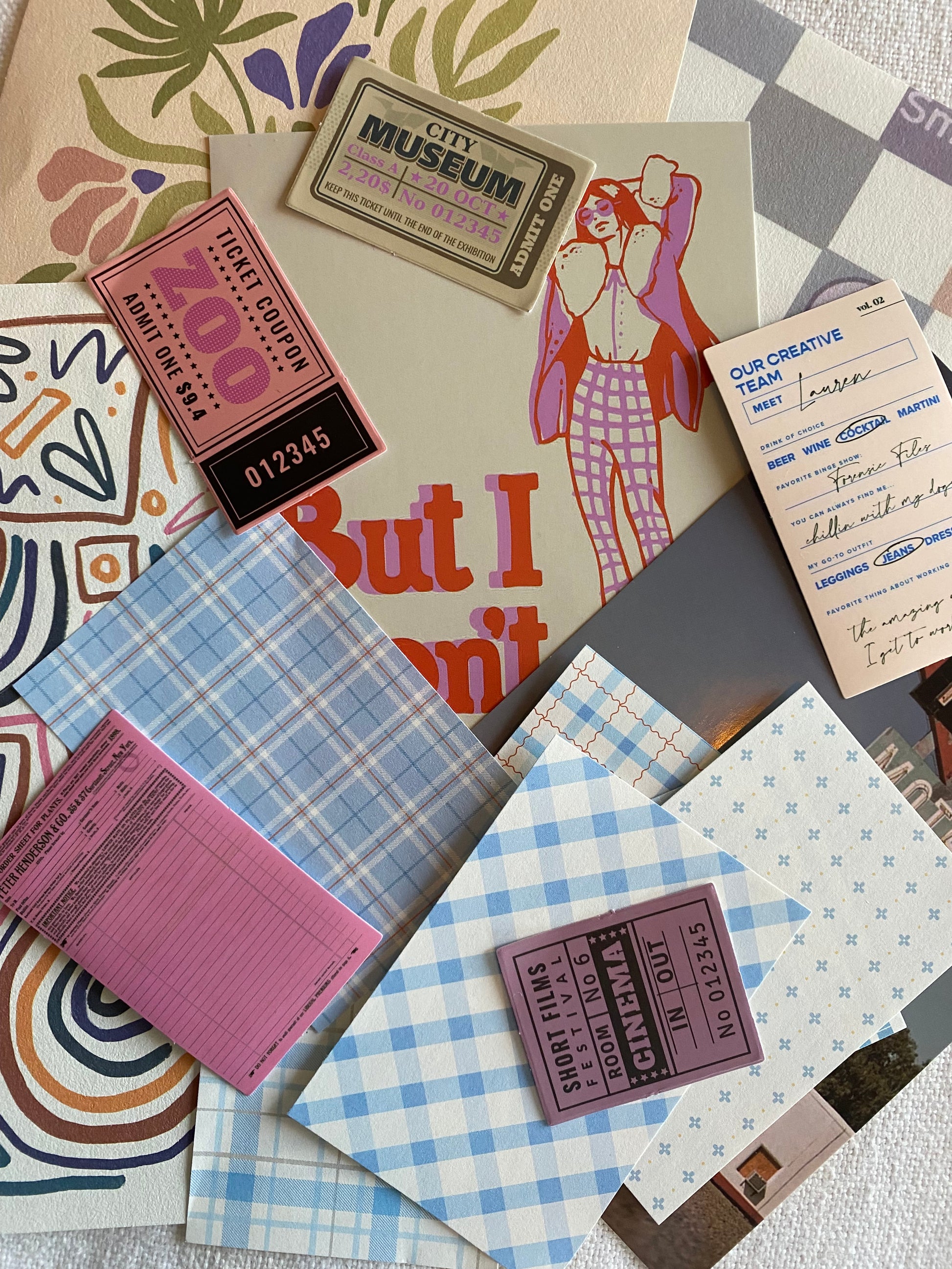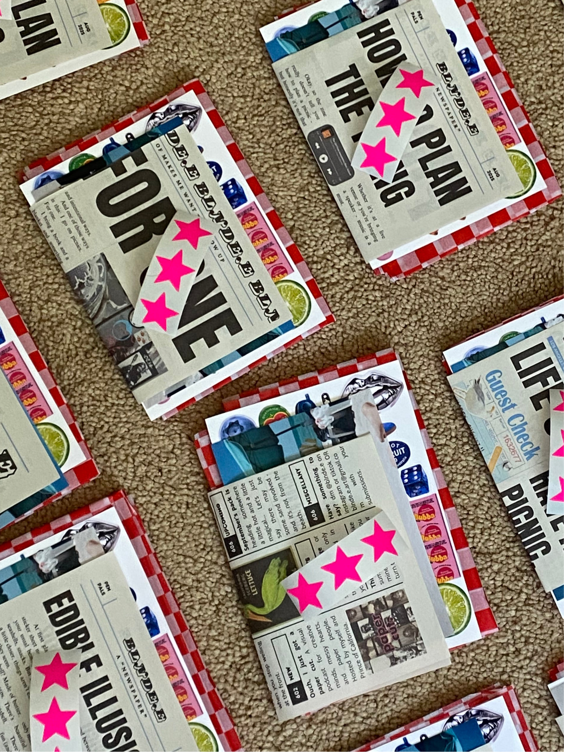 - Ephemera (paper, business cards, tickets, magazine cutouts, and ribbon)